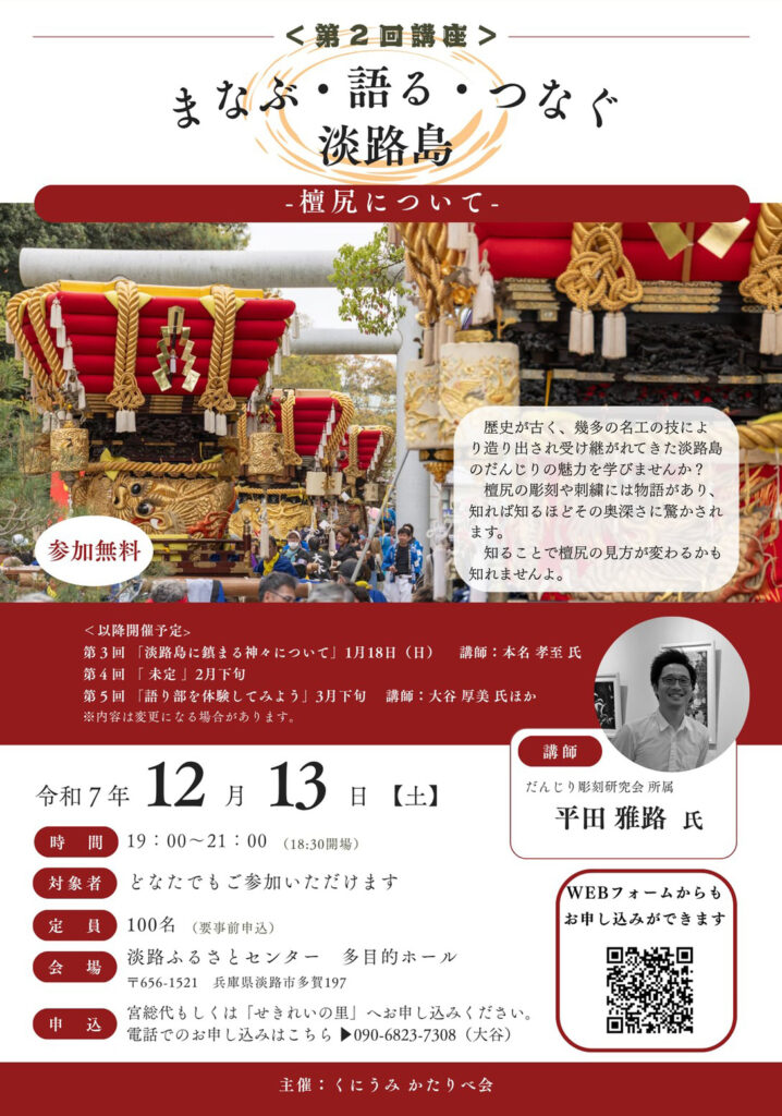 平田雅路が、第2回講座「まなぶ・語る・つなぐ淡路島」(くにうみかたりべ会)にて、「檀尻(ダンジリ)」についての講演を行ないます。瀬戸内海に広がる太鼓台や地車文化を概観しながら、主に伊弉諾神宮の祭に出されるダンジリの彫刻や刺繍についてお話しいたします。島内外問わず、ご興味のある方はぜひお越しいただければ幸いです。